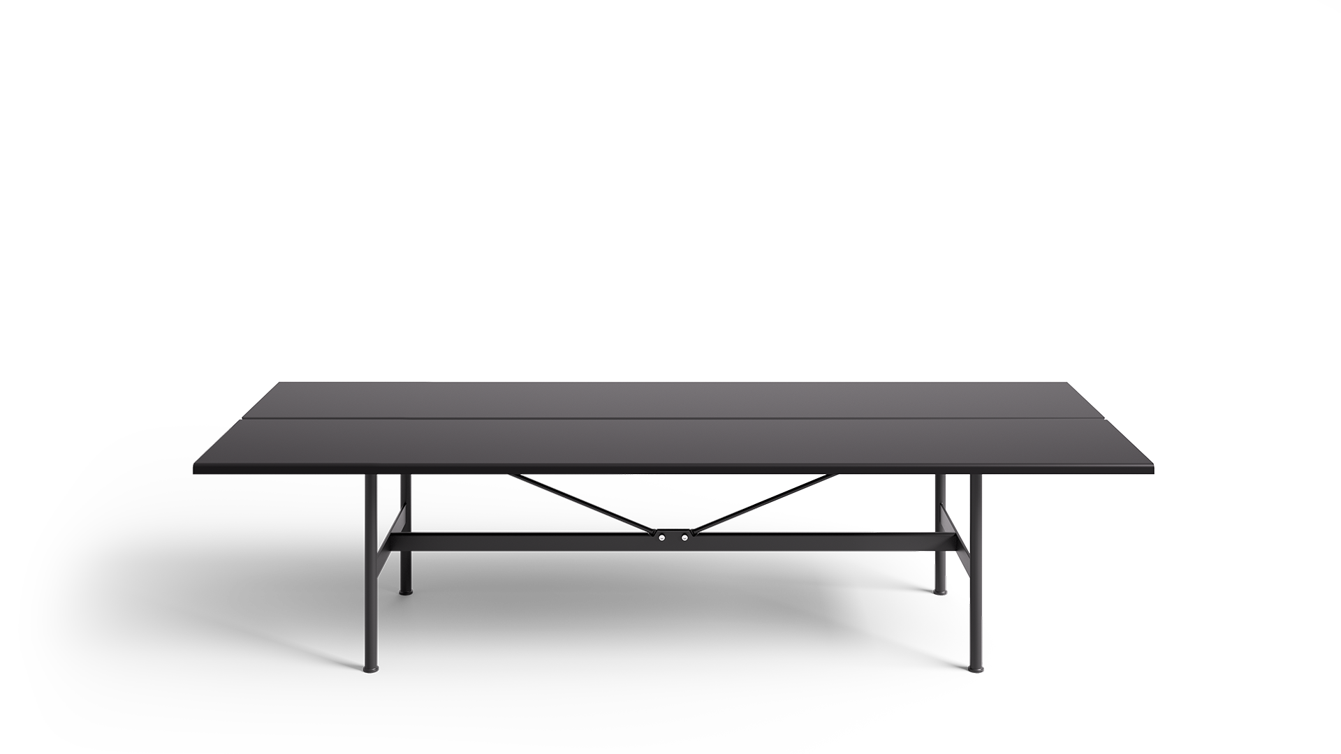Table with steel tube legs and completely removable structure assembled with visible mechanical fixings. Top composed of bent sheet metal, in wood or marble.