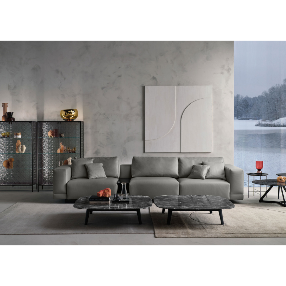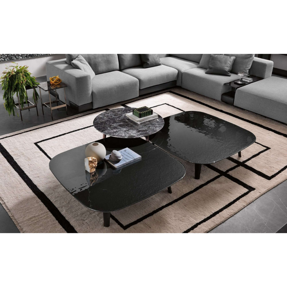 Elegant coffee table featuring a 12 mm fused, tempered, back-painted glass top in semi-transparent or metallic shades, paired with a solid wood frame in tobacco or black finishes.