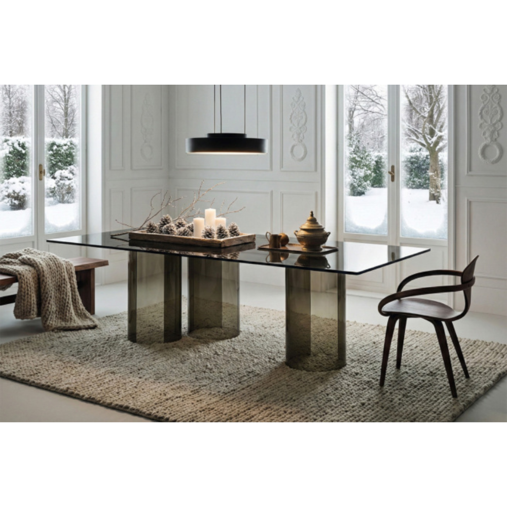 The Luxor dining table features a striking all glass structure with asymmetrical base and curved legs, combining innovative design and artistic appeal to create a dramatic contemporary dining centerpiece.