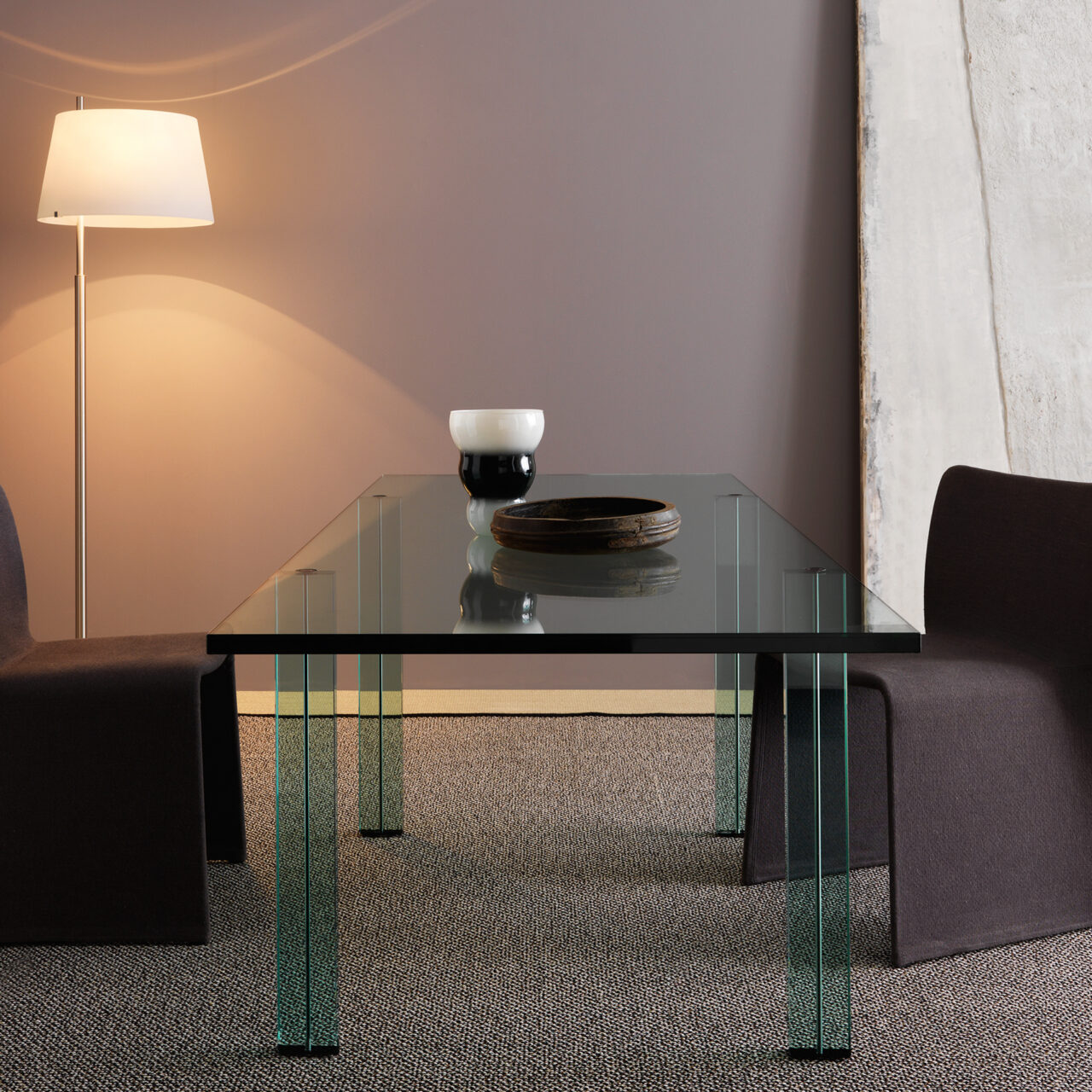 The Teso collection by FontanaArte, designed by Renzo Piano in 1985, brings elegant minimalist furniture into modern interiors using stratified float glass as the core material. Designed for lovers of contemporary design and refined materiality, Teso celebrates transparency and structural purity.