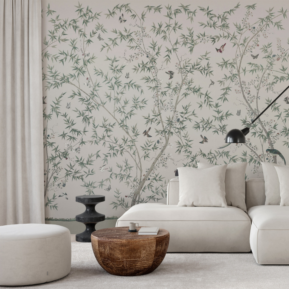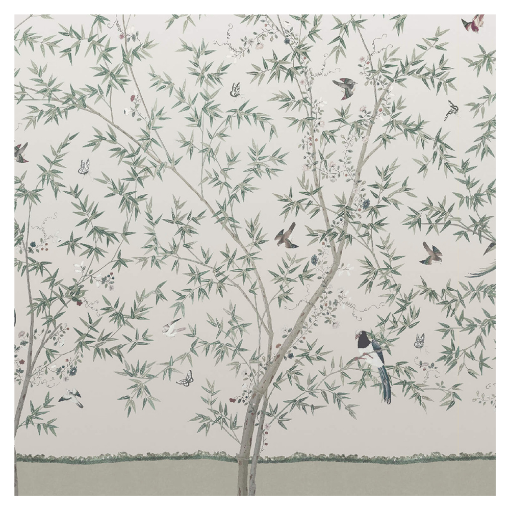 Inspired by the 1785 Chinese bedroom wallpaper at Belton House, this design features bamboo, birds, butterflies and flowers, adapted from a garden party scene and simplified for an elegant repeating panel.
