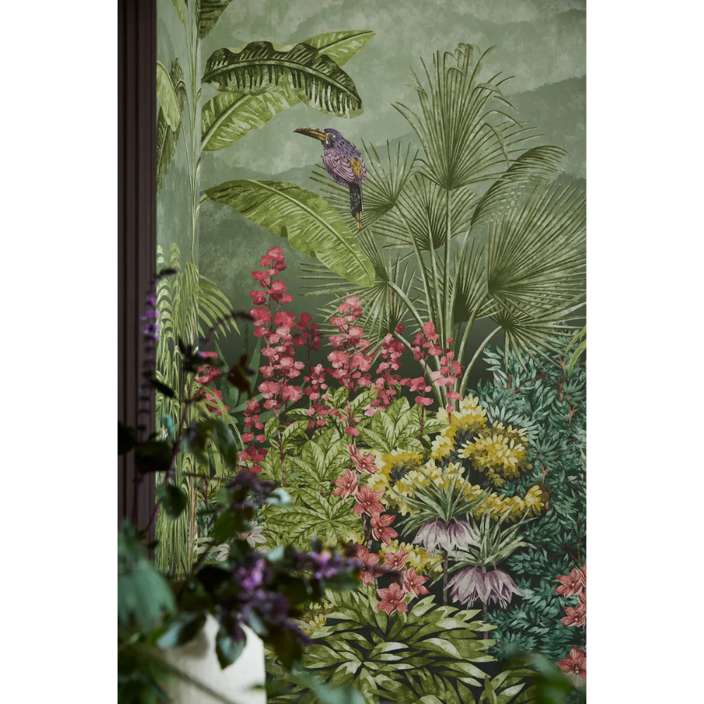 Decorative mural wallpaper inspired by early 19th-century Velay and Zuber panels, featuring lush landscapes with monkeys and tropical birds, creating a romantic, exotic atmosphere across repeating panels.