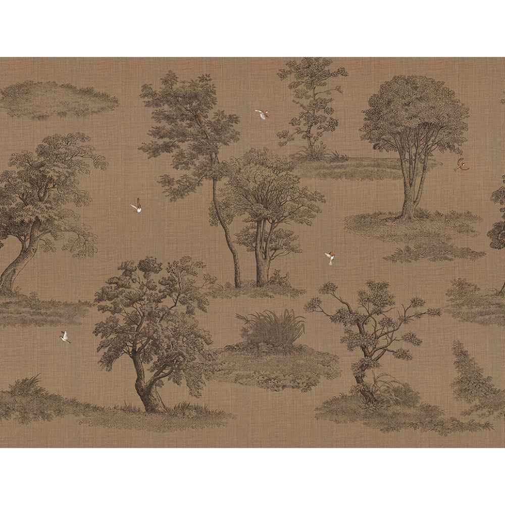 Mofuku wallpaper by LondonArt, designed by Nicola Bottegal, evokes serenity with a muted wooded landscape. Featuring cinerary trees that symbolize peace and immortality, its tranquil imagery invites reflection and transforms walls into a meditative, contemplative space.