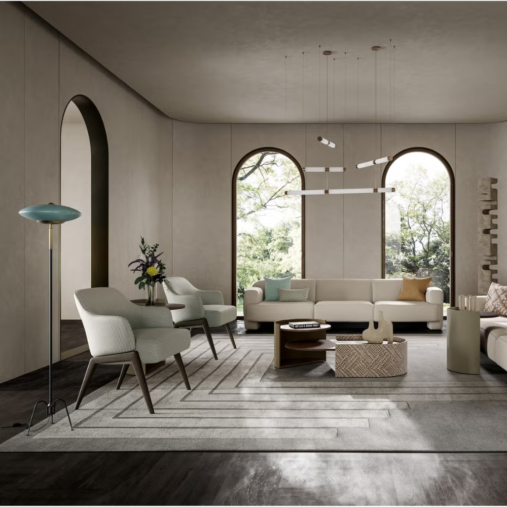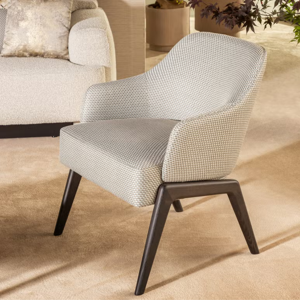 Gio armchairs, inspired by Gio Ponti, feature suspended upholstered seats, solid wood legs, integrated high or low backrests with armrests, refined proportions, and sophisticated interlocking design, ideal for residential and public interiors.