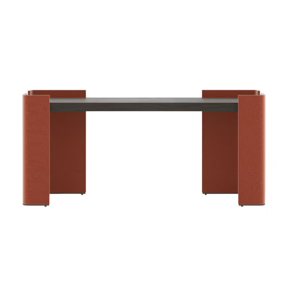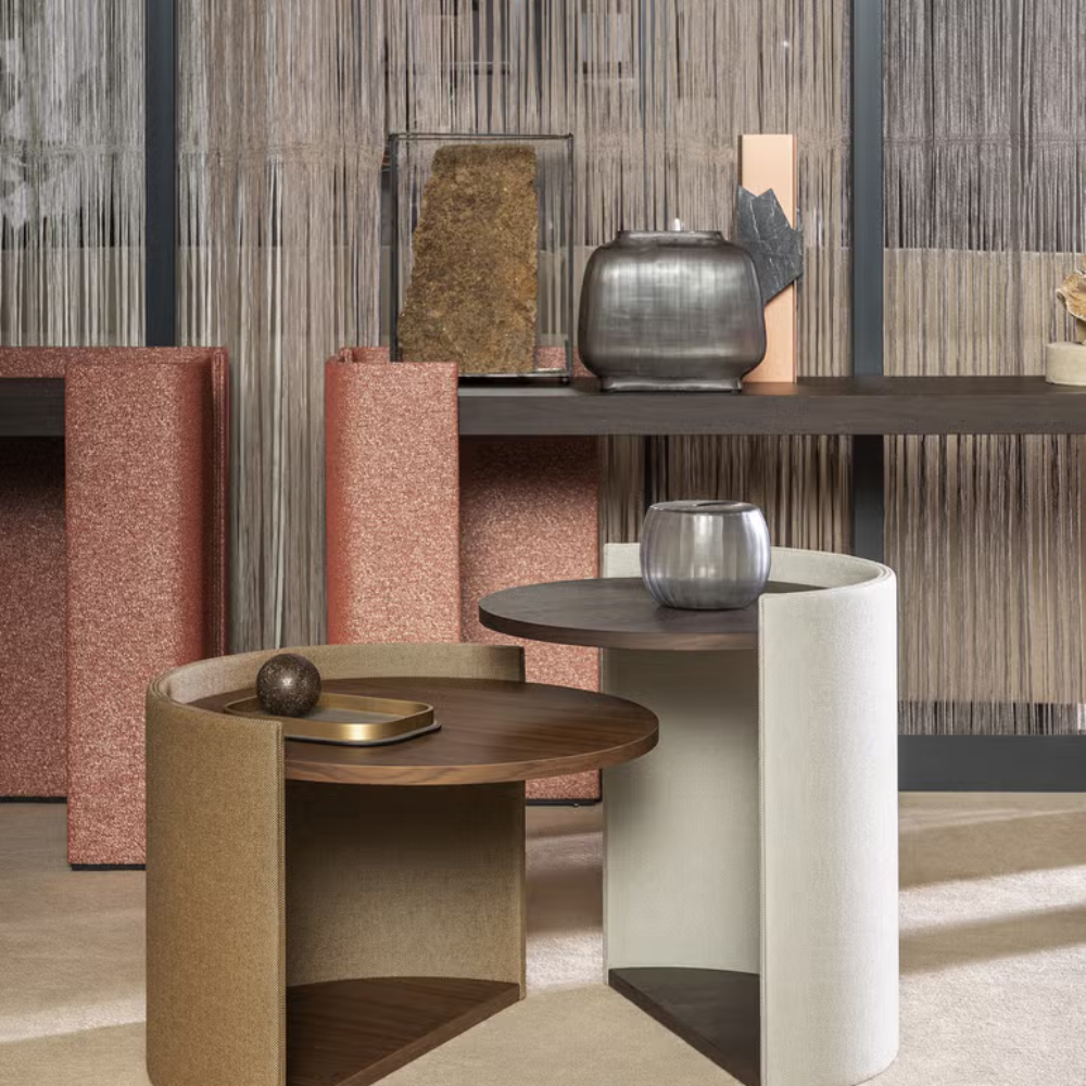 Sinua collection combines curved fabric-covered panels with linear walnut tops, creating elegant desks, consoles, and coffee tables with sculptural contrast.
