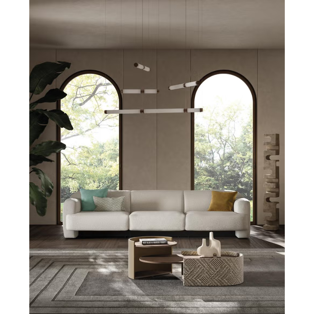 Yak modular sofa features contemporary curved design, monolithic presence, and versatile configurations. Inspired by Art Deco, it offers exceptional comfort, elegant aesthetics, and customizable upholstery with premium Rubelli fabrics.