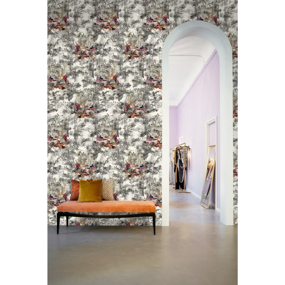 Déjeuner sur l’herbe wallcovering is a washable, fire-retardant vinyl wallpaper with excellent lightfastness, aligned repeat, and easy dry-peel installation.