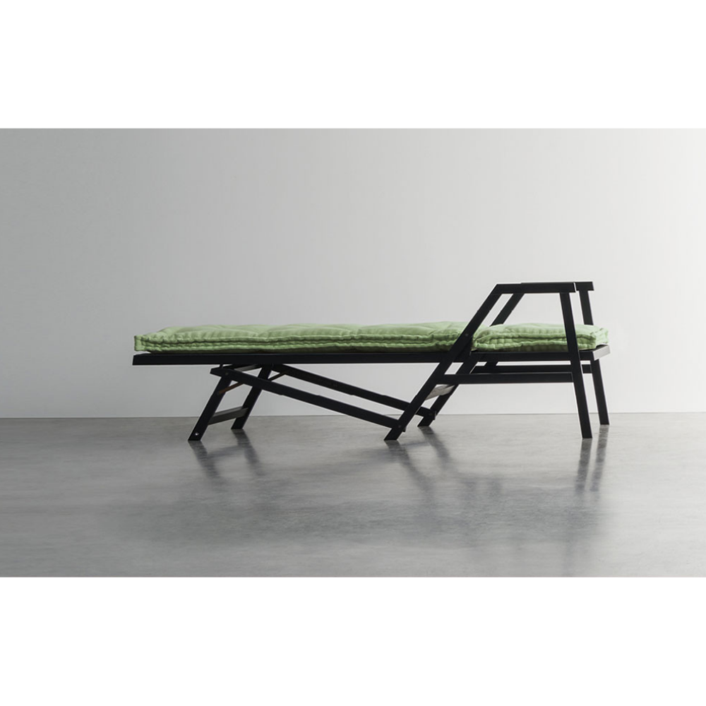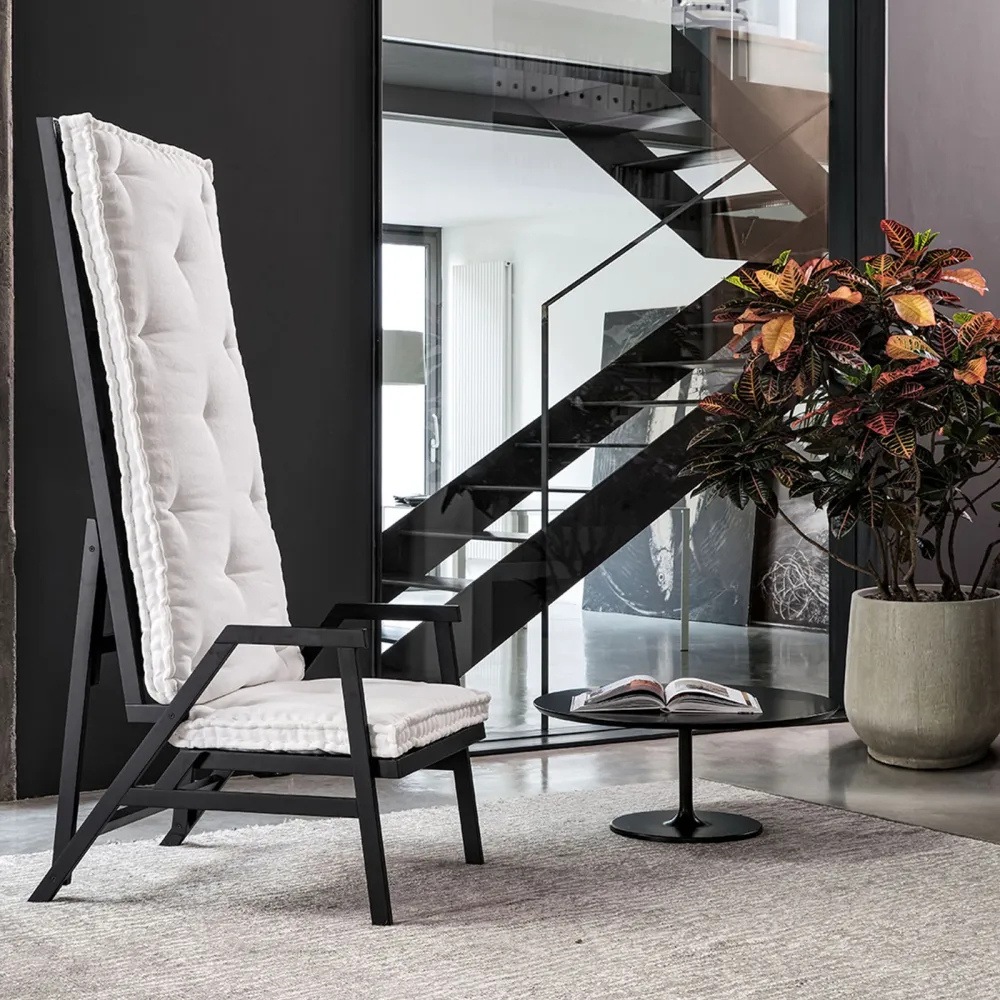 Polet by Achille Castiglioni is a multifunctional armchair bed with a high backrest, blending elegance and comfort. This unique design transforms from throne-like seating into a relaxing bed, perfect for stylish, versatile living spaces.