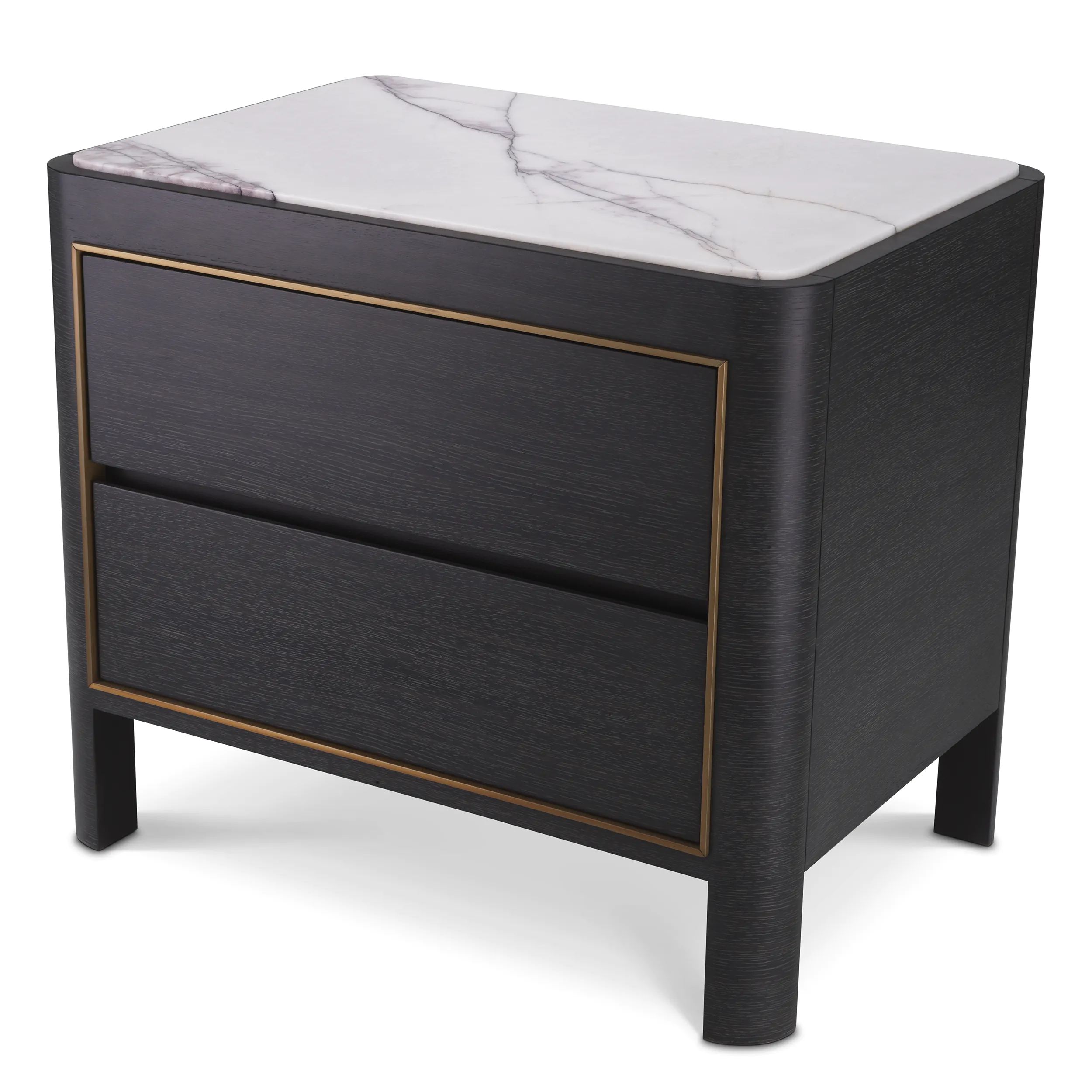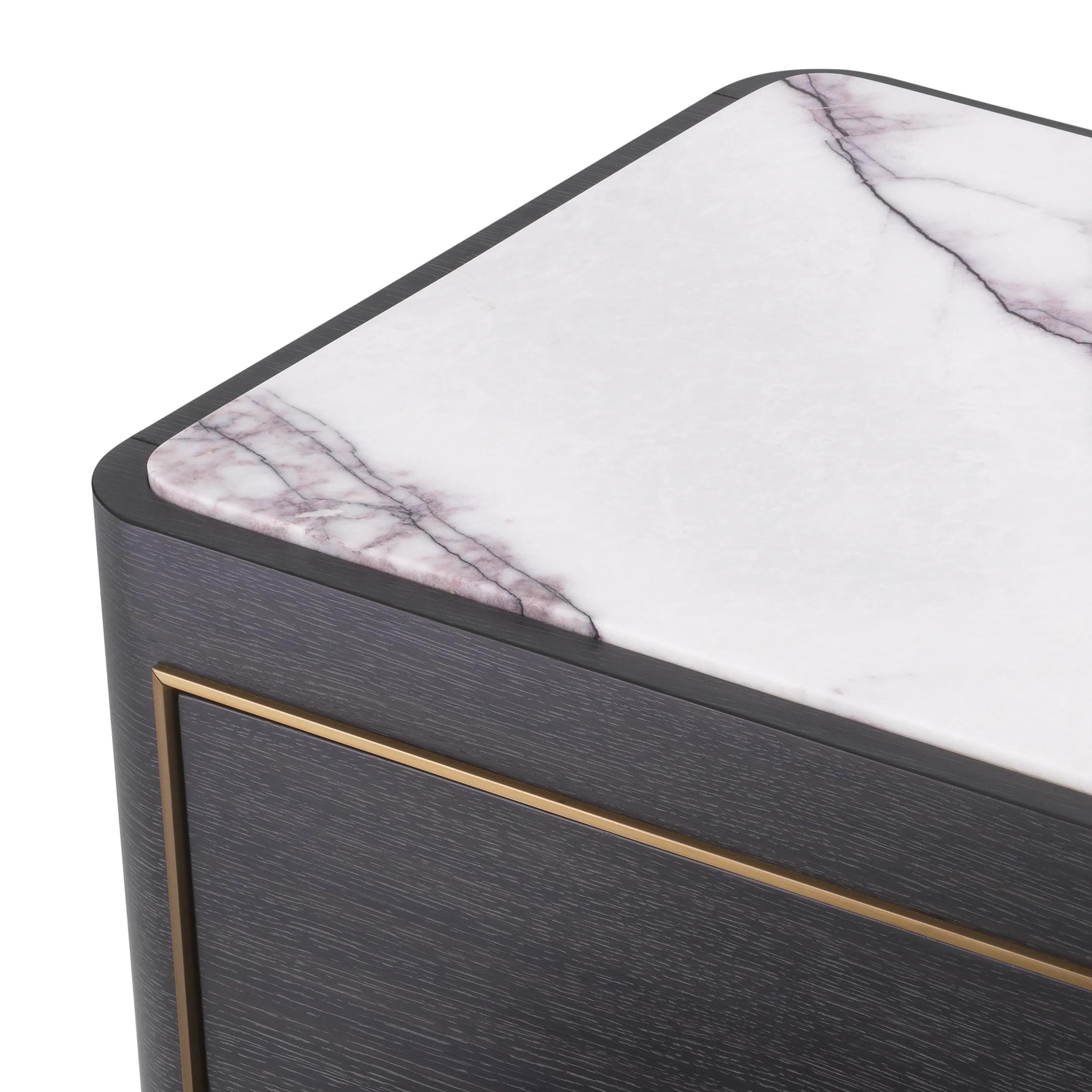 The Corazon Nightstand is a chic and organized nightstand. Wrapped in anthracite gray oak veneer and accented with an Italian lilac white marble top, this beautiful piece will enhance the style of your bedroom. The drawers are framed by a brushed brass border and offer ample space for storing books, phone accessories, and the like.