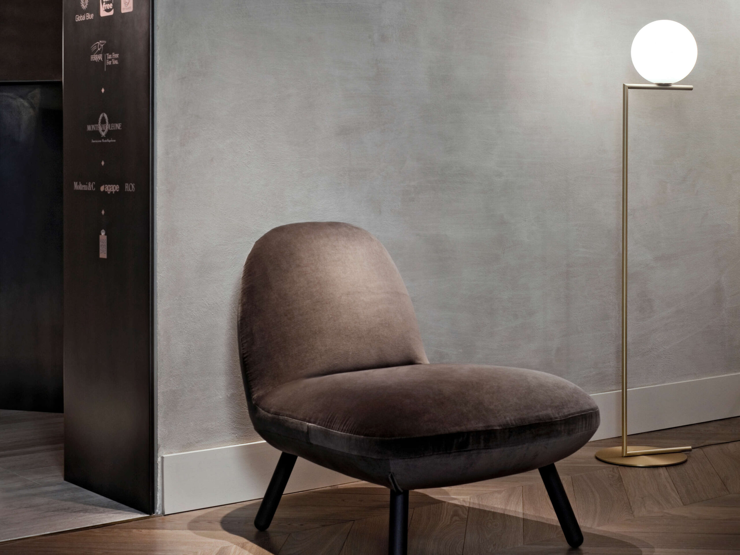 Floor lamp with diffused light. Frame in brushed and clear-painted brass or chrome-plated steel. Opal blown glass diffuser.