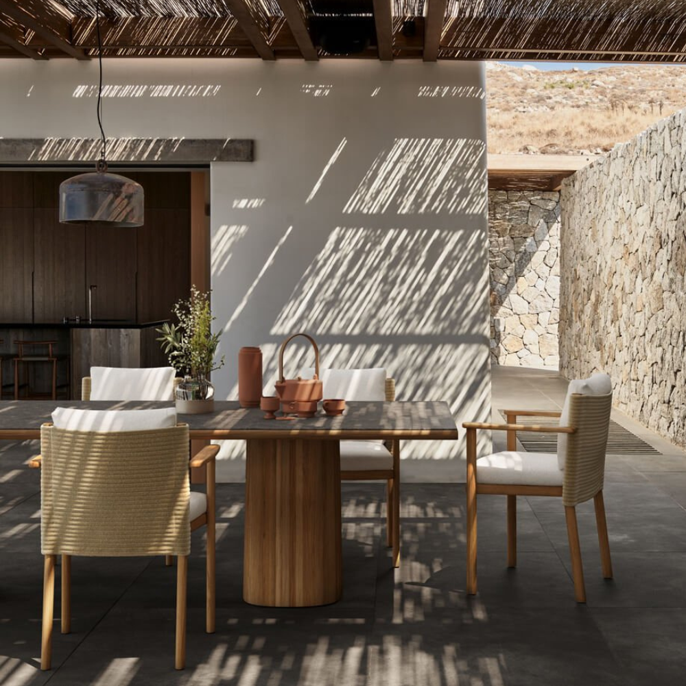 Giro collection blends pure lines, rich textures, and varied materials, harmonizing indoor and outdoor spaces with warmth, tactility, and elegance.