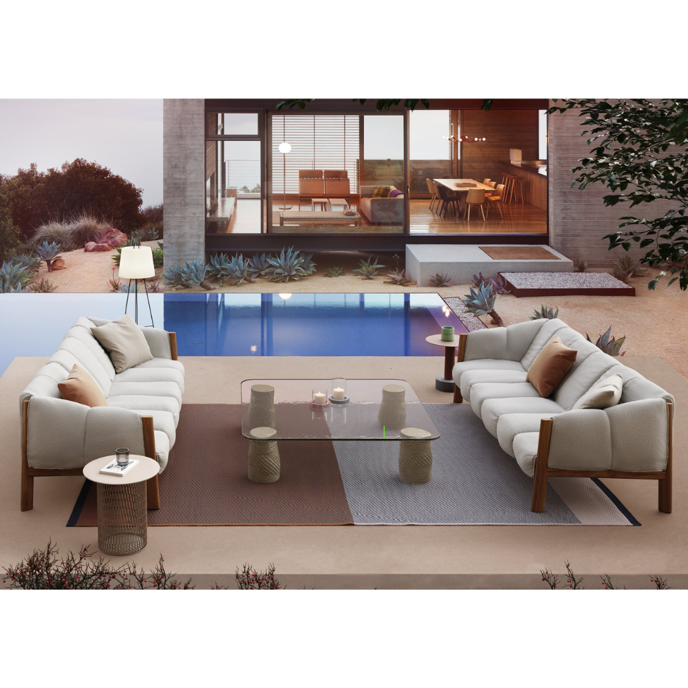 Plumon wraps a teak frame with a padded, tailored cover, blending effortless usability with soft comfort and elegant outdoor design.
