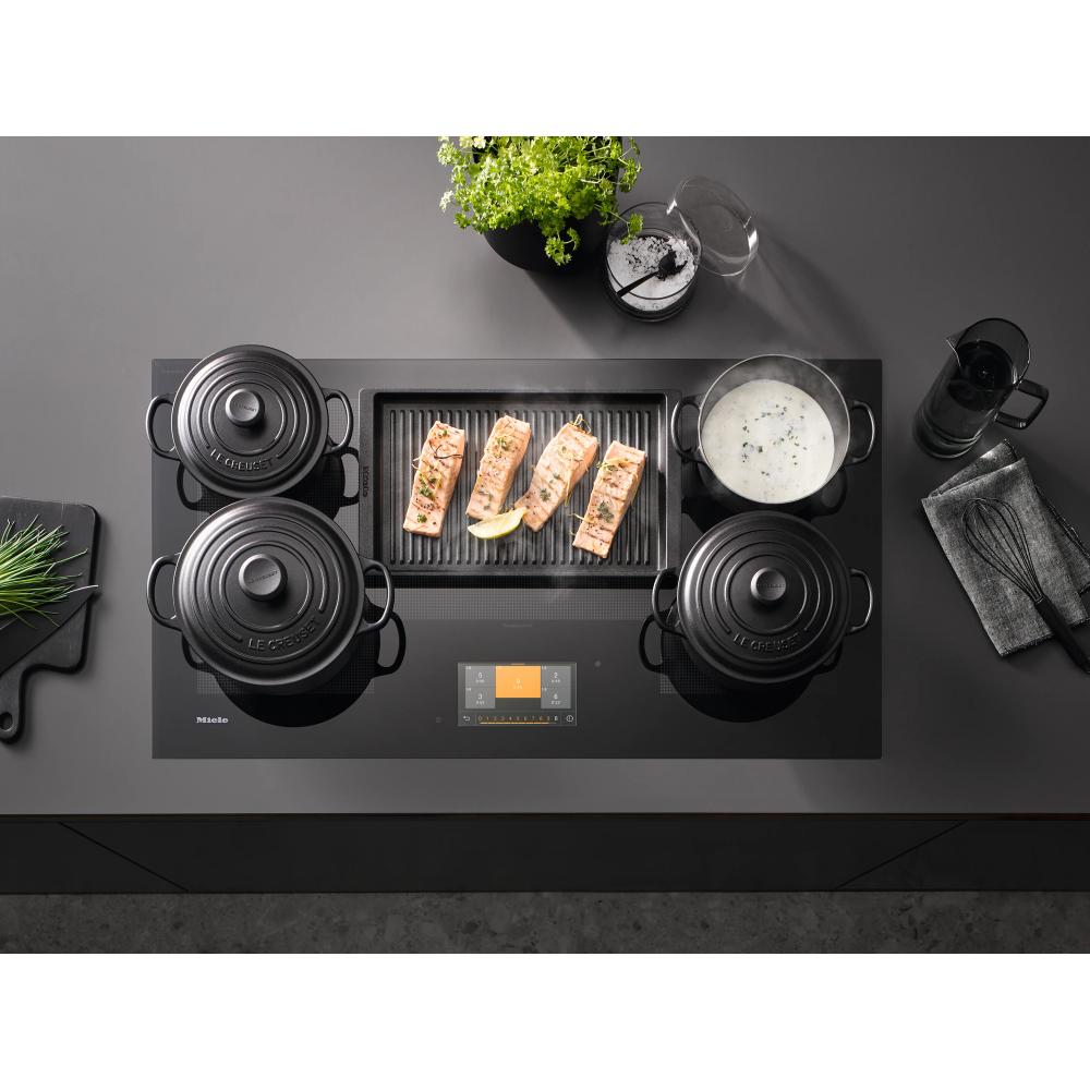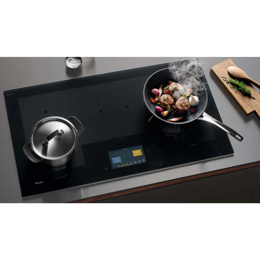 Miele KM 7999 FR induction cooktop features precise TempControl, flexible cooking zones, smart connectivity, and elegant stainless steel framed design.