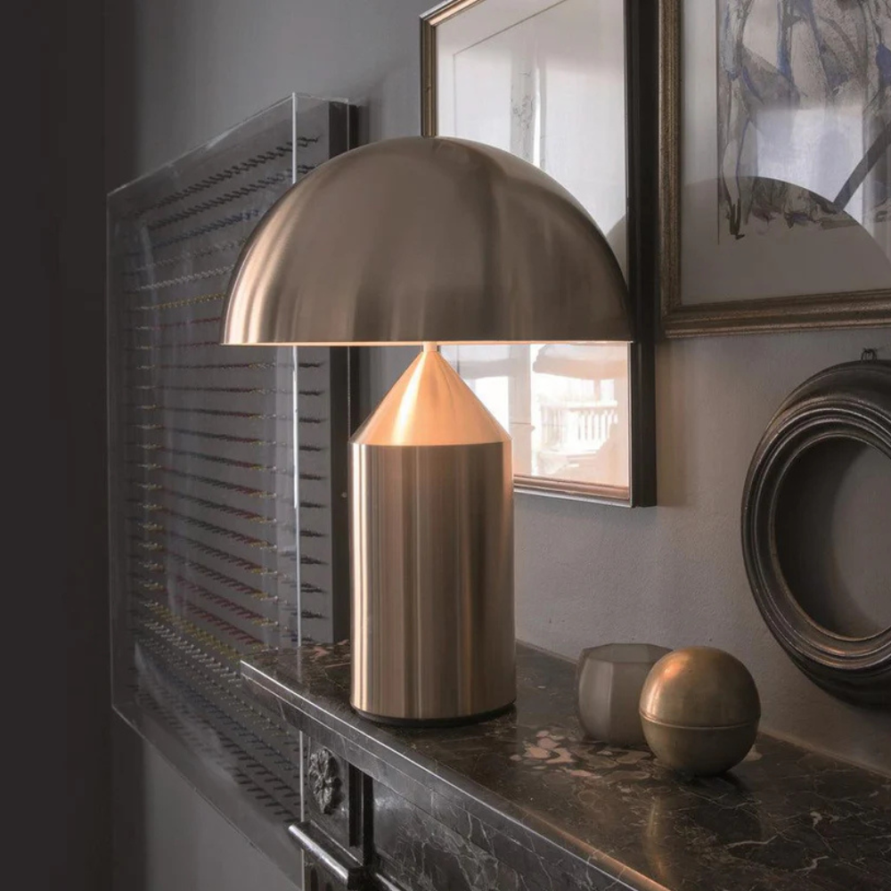 The Atollo table lamp, an icon of Italian design, blends geometric elegance and timeless style. Winner of the 1979 Compasso d’Oro, available in multiple sizes and finishes.