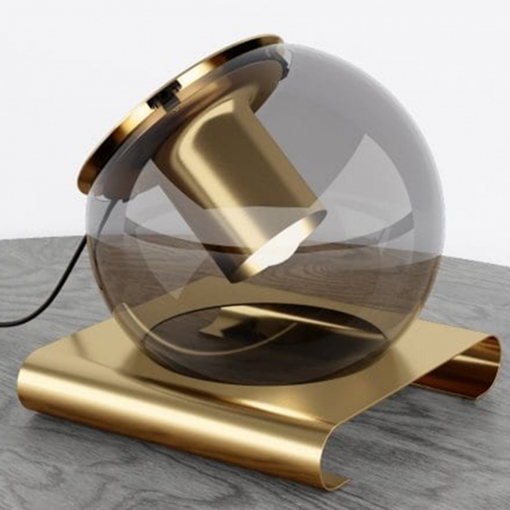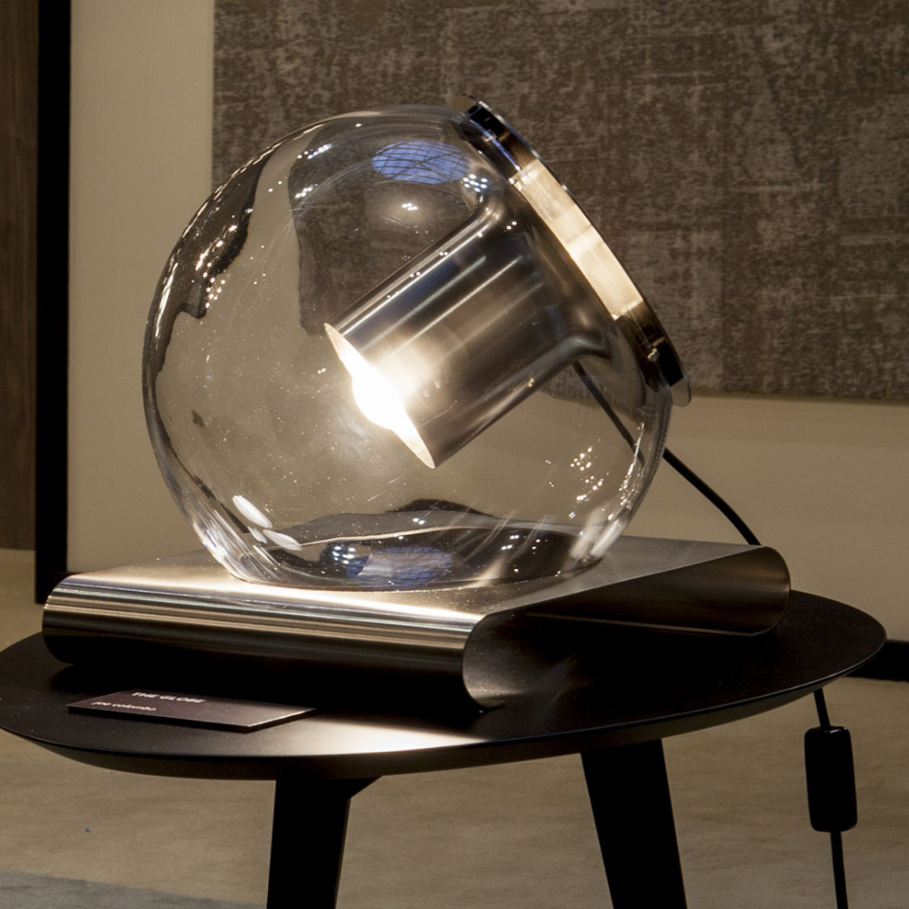 Available in table, pendant, and wall versions, this elegant lamp combines blown glass and metal, balancing form and function with satin nickel or gold-bronze finishes.