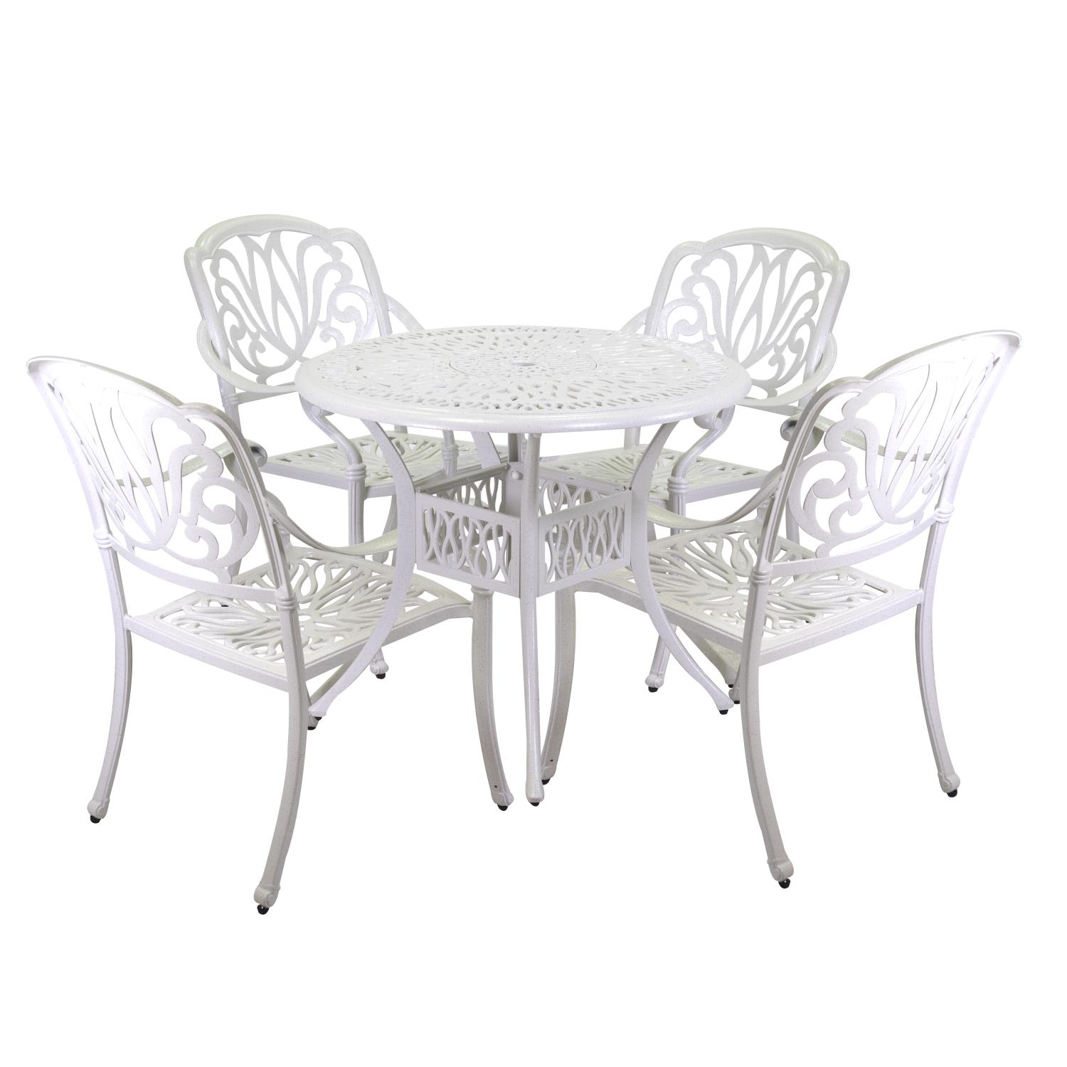 Outdoor set consisting of a round table and four armchairs, all made of cast aluminum to ensure strength, lightness, and weather resistance. The coated structure provides long-term protection and low maintenance, making the set suitable for outdoor use in residential and contract settings such as terraces, gardens, and hospitality spaces.