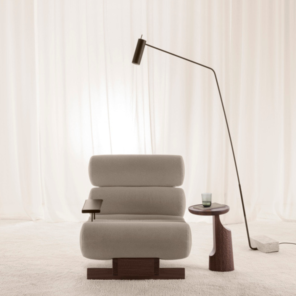 This armchair features rounded, harmonious lines and a supportive bolstered backrest. With balanced proportions and refined details, it delivers total comfort for sophisticated, elegant spaces.