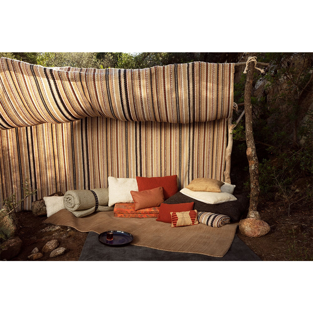 QASHQAI è un tessuto a righe in doppia altezza, dalla trama ricca e grezza, che ricorda i tradizionali tessuti a mano dei nomadi Qashqai. I filati di trama voluminosi e liberamente ritorti conferiscono alla tenda un carattere artigianale.