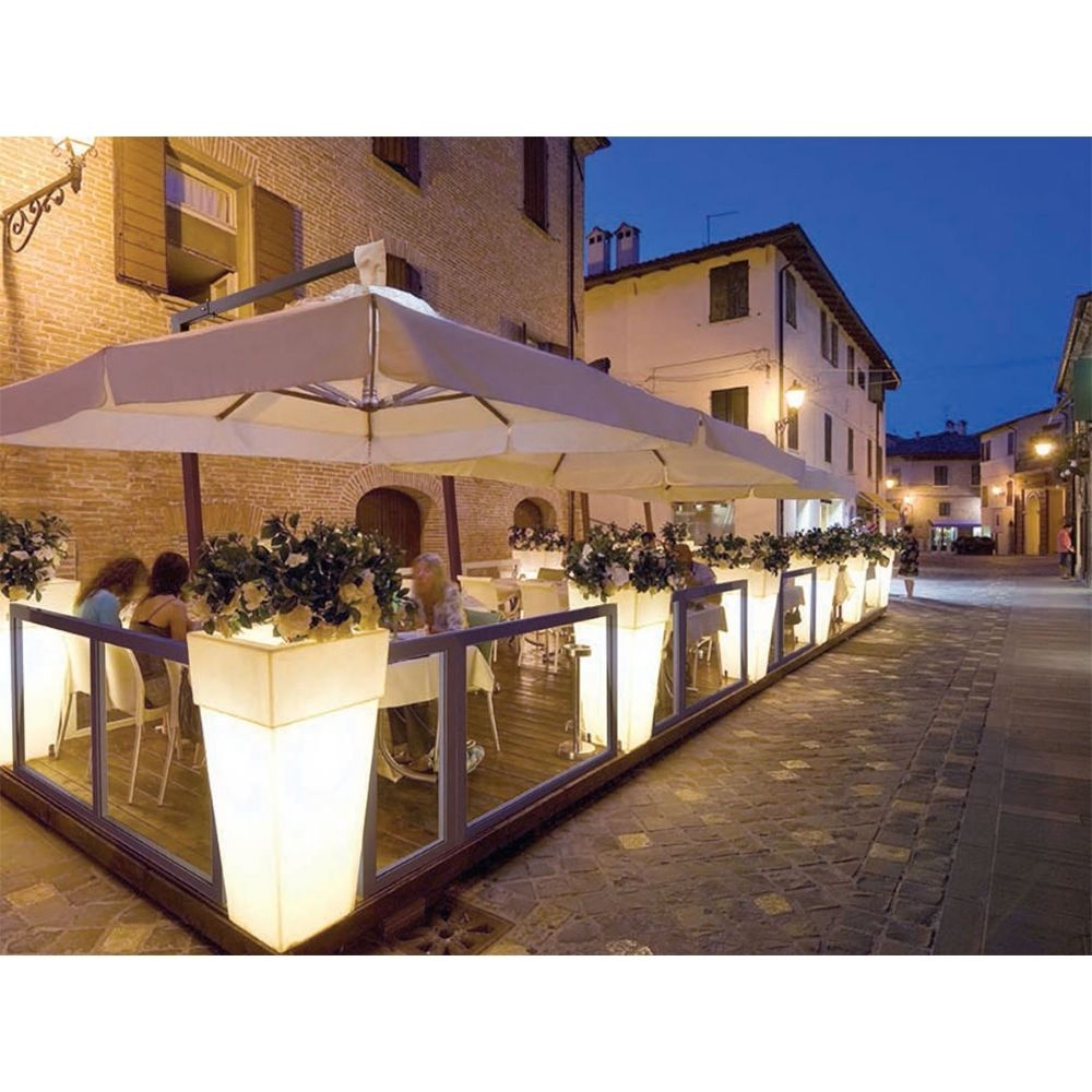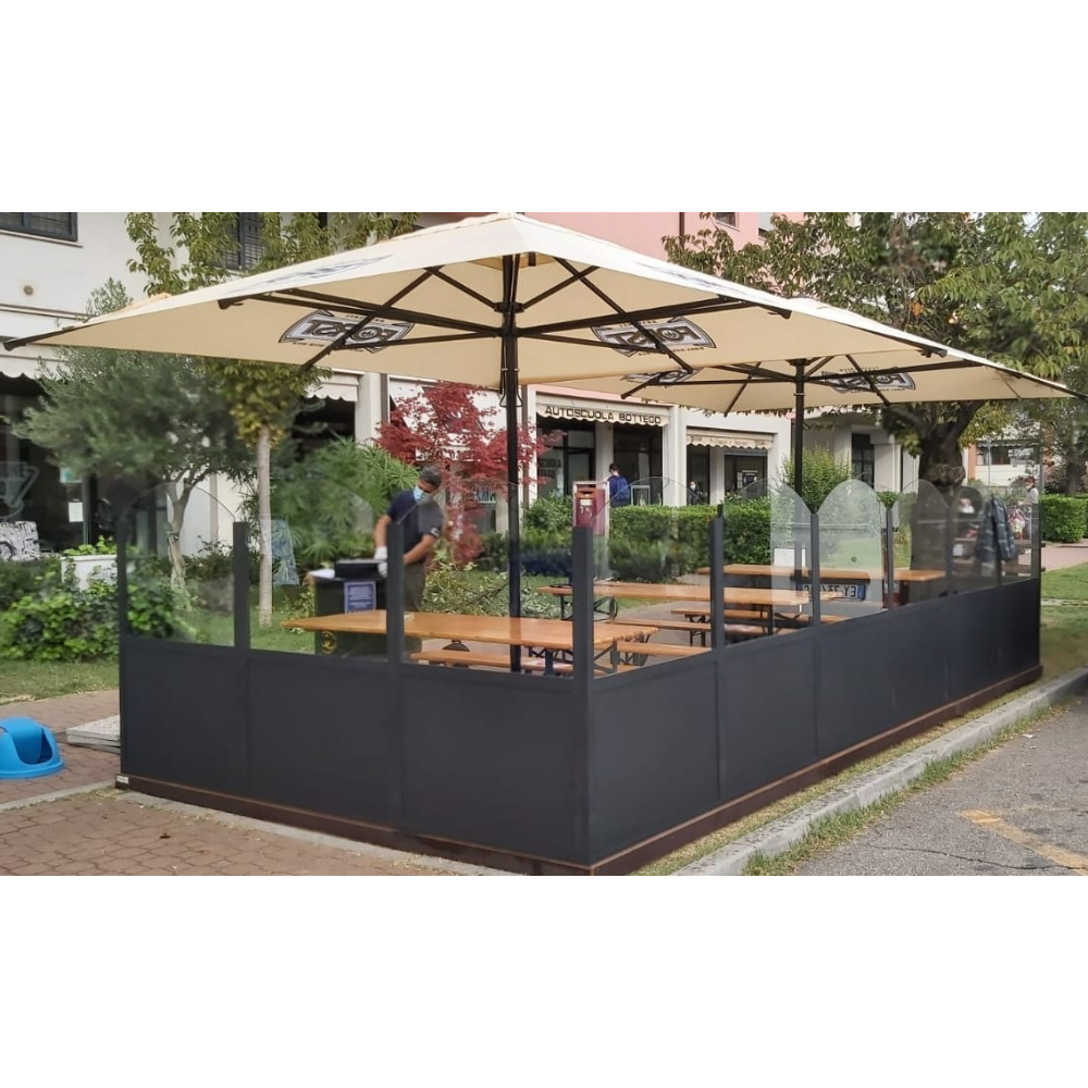 Questa innovativa struttura offre pannelli in vetro trasparente o alluminio con altezze regolabili, garantendo un’efficace protezione da pioggia, vento e rumore urbano, mantenendo al contempo stile e versatilità per gli spazi esterni.