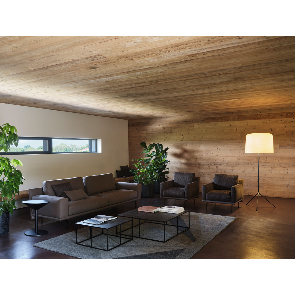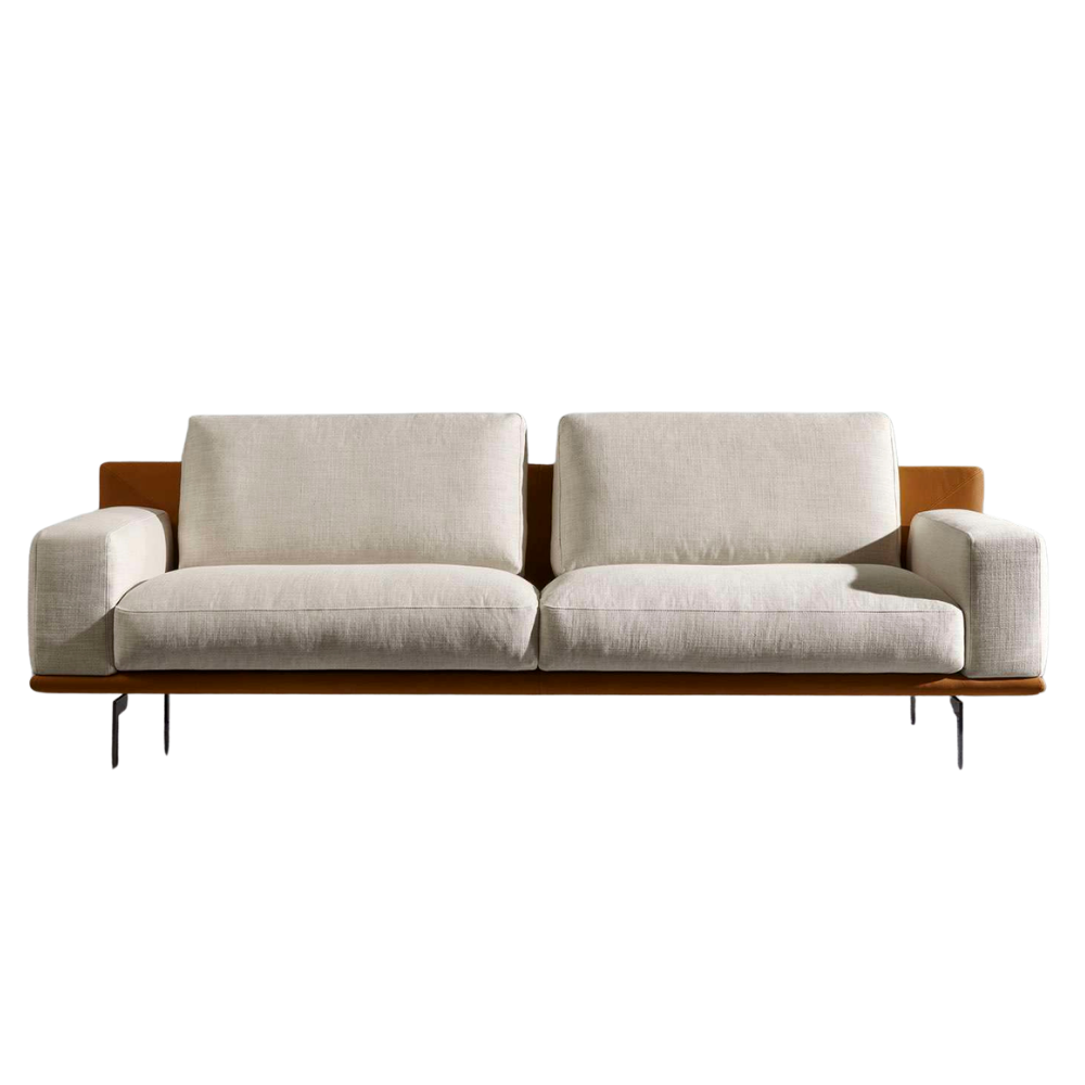 Il divano Etan presenta un design geometrico audace, una base ultrasottile, piedini in nichel nero e cuscini ariosi per un comfort elegante e aerodinamico.
