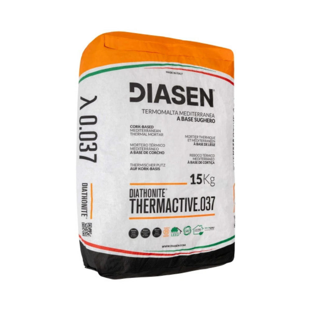 Diathonite Thermactive .037 è un intonaco isolante traspirante a base di calce per pareti e soffitti. Realizzato con materiali naturali, migliora le prestazioni termiche, riduce l’umidità e contribuisce all’asciugatura degli edifici più datati, mantenendo al contempo condizioni interne salubri.