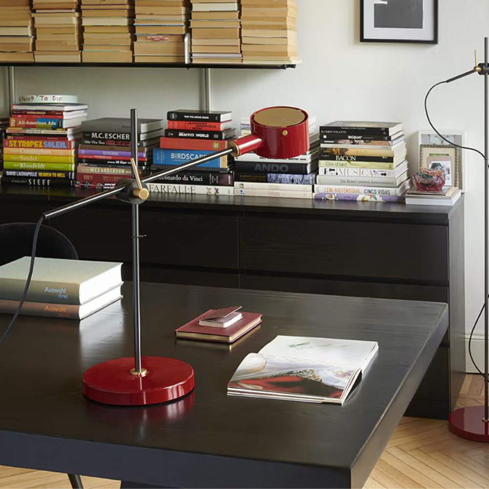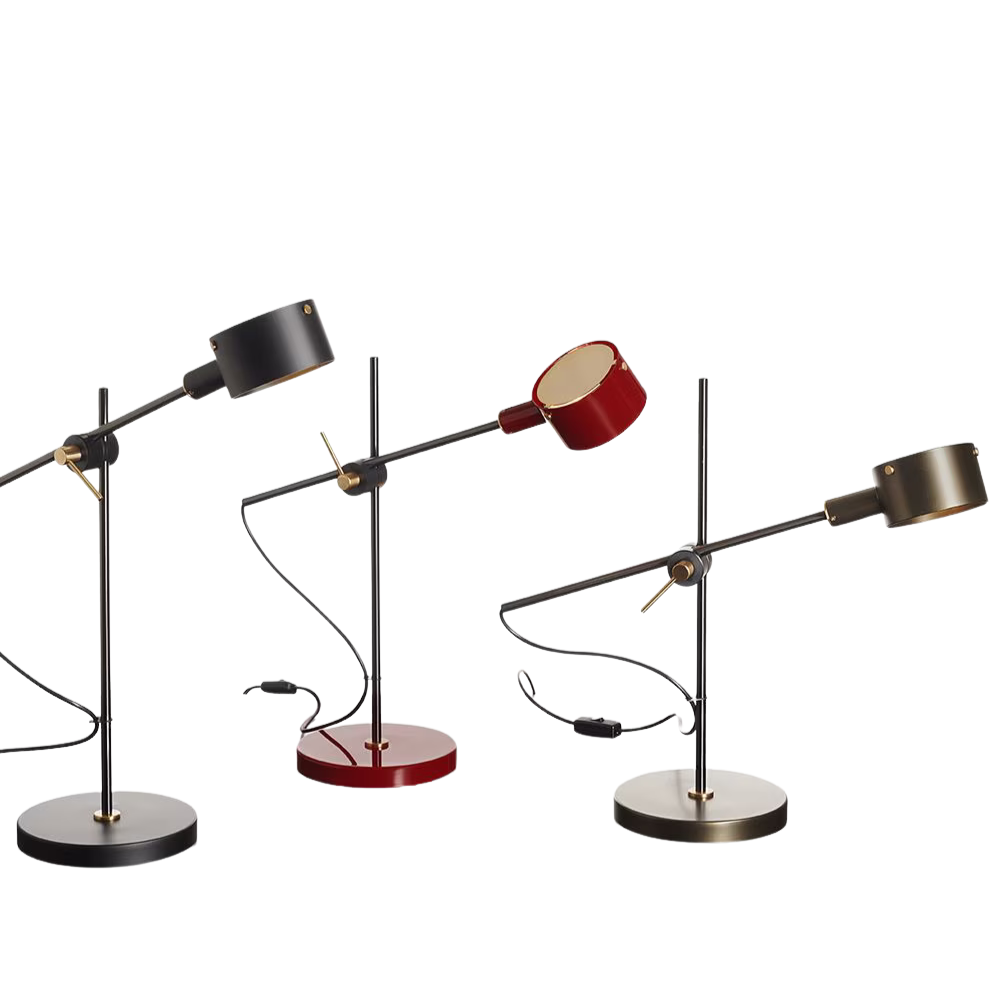 Scopri GO, una lampada contemporanea di Oluce con bracci regolabili, dettagli in oro satinato ed eleganti paralumi cilindrici in nero, rosso scarlatto o bronzo anodico.