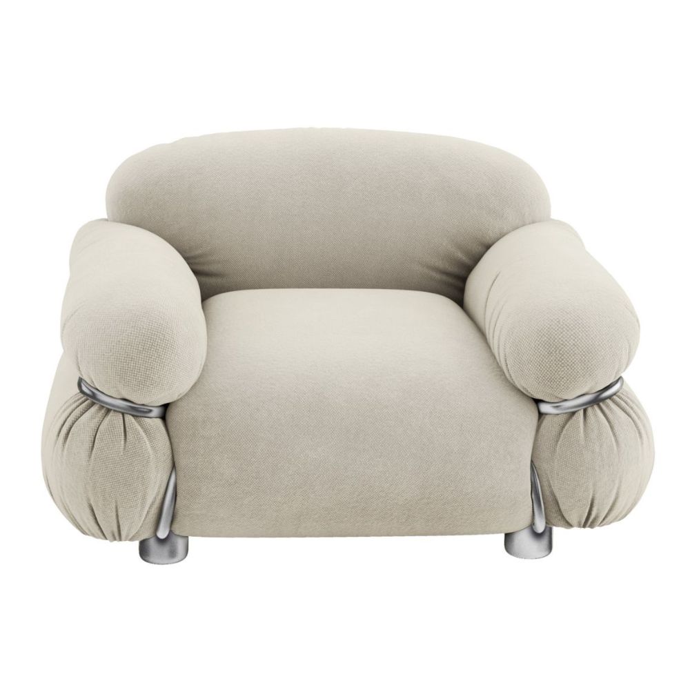 Struttura/Dettagli: Staffe strutturali a vista in metallo satinato o alluminio su braccioli e gambe