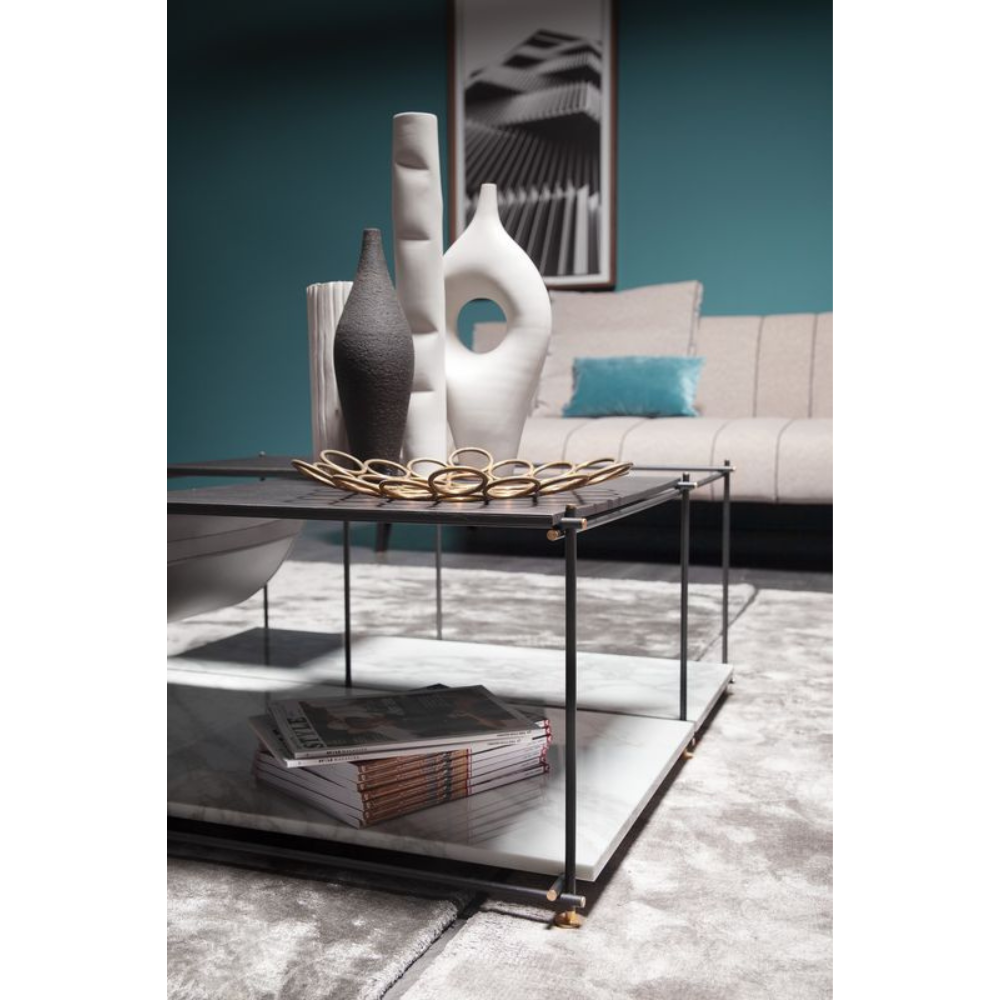 Le finiture in ottone lucido impreziosiscono la struttura con raffinata eleganza, sostenendo ripiani disponibili in rovere tinto ombra o metallo brunito, creando un sofisticato equilibrio tra calore, modernità e fascino del design senza tempo.