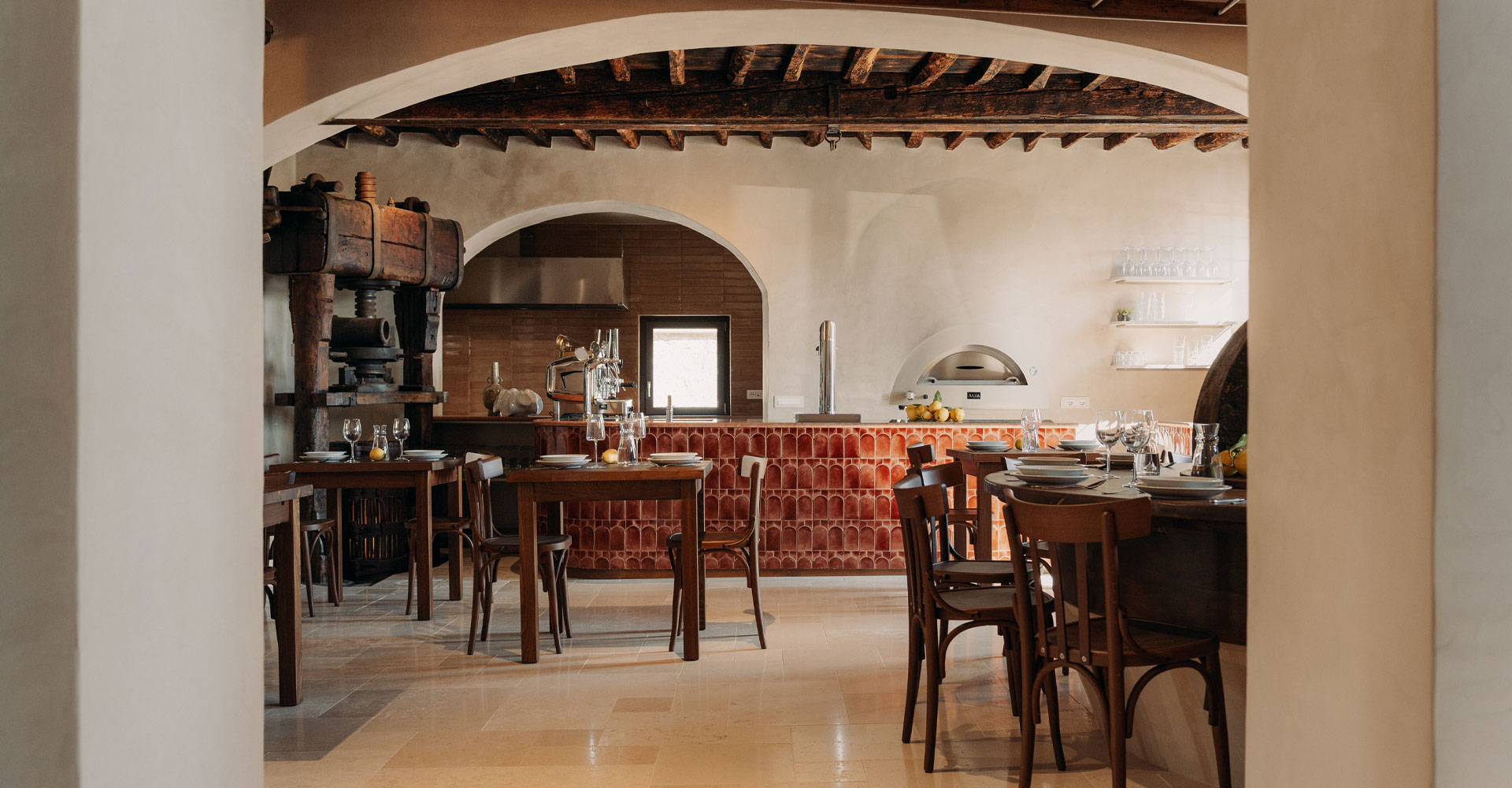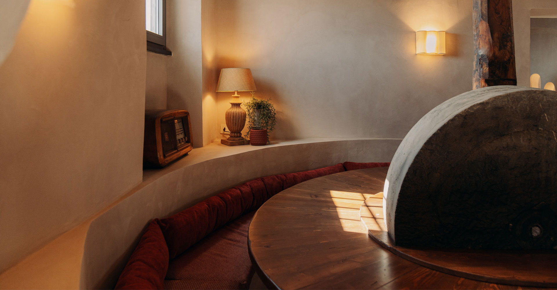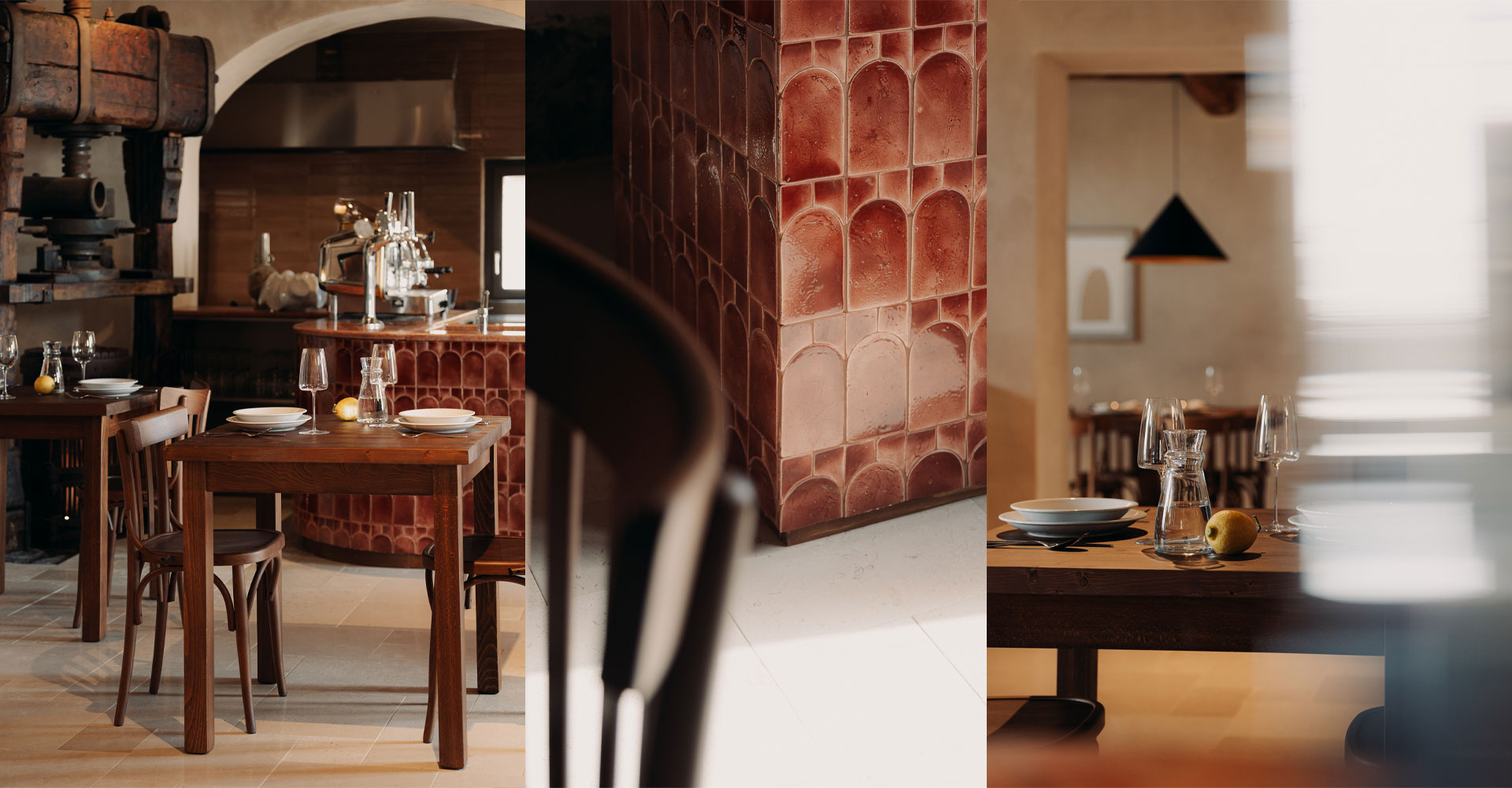 Gli interni si distinguono per l’uso di materiali naturali come legno, calce e cocciopesto, arricchiti da dettagli artigianali e giochi di luce calda che scolpiscono lo spazio. Elementi iconici come il grande tavolo conviviale ricavato da un antico frantoio e le nicchie retroilluminate sulle pareti raccontano un legame profondo con il territorio e la sua storia.
