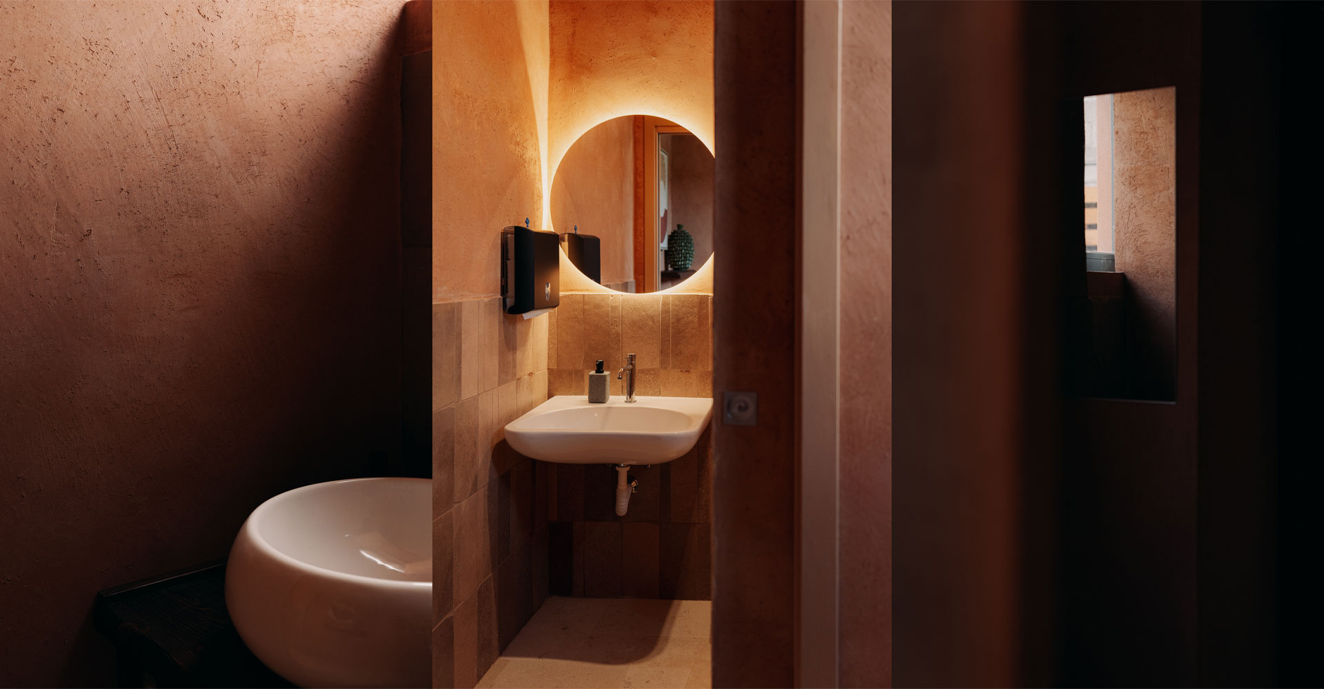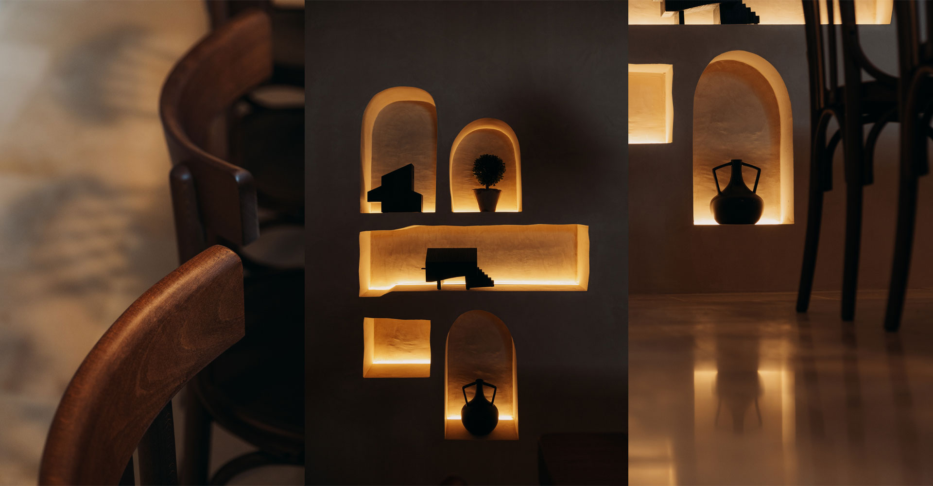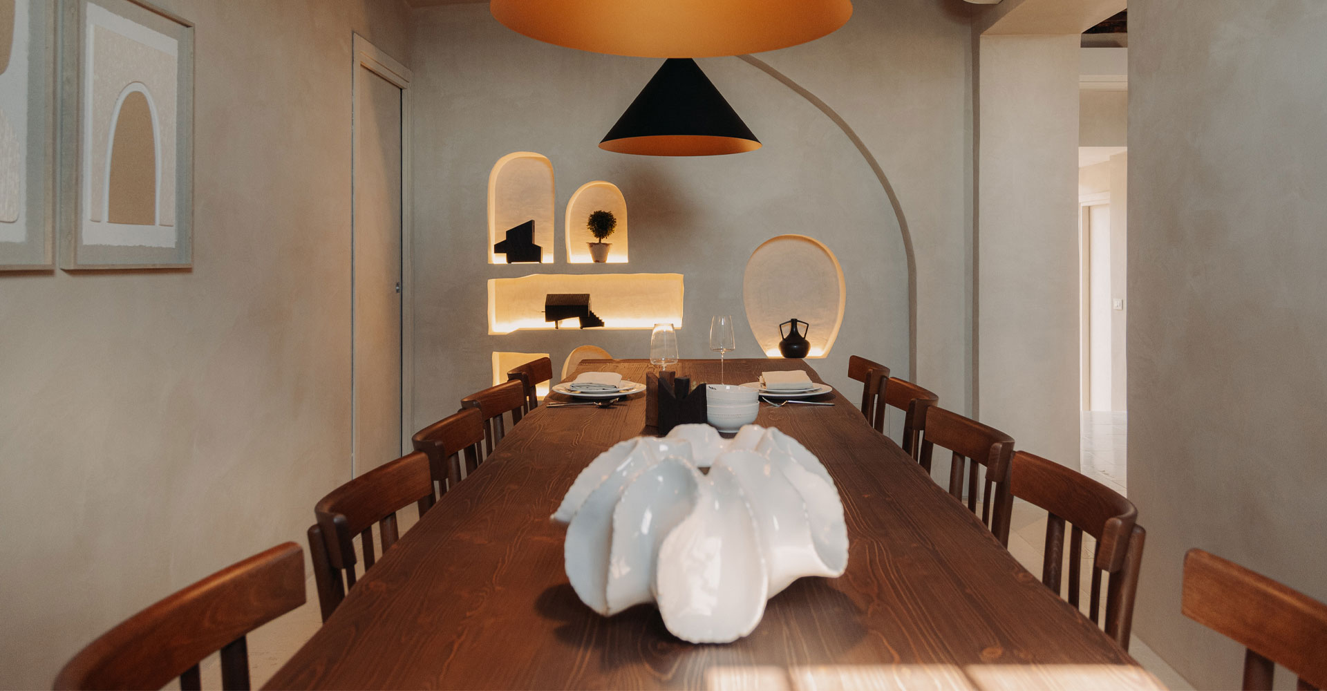Gli interni si distinguono per l’uso di materiali naturali come legno, calce e cocciopesto, arricchiti da dettagli artigianali e giochi di luce calda che scolpiscono lo spazio. Elementi iconici come il grande tavolo conviviale ricavato da un antico frantoio e le nicchie retroilluminate sulle pareti raccontano un legame profondo con il territorio e la sua storia.